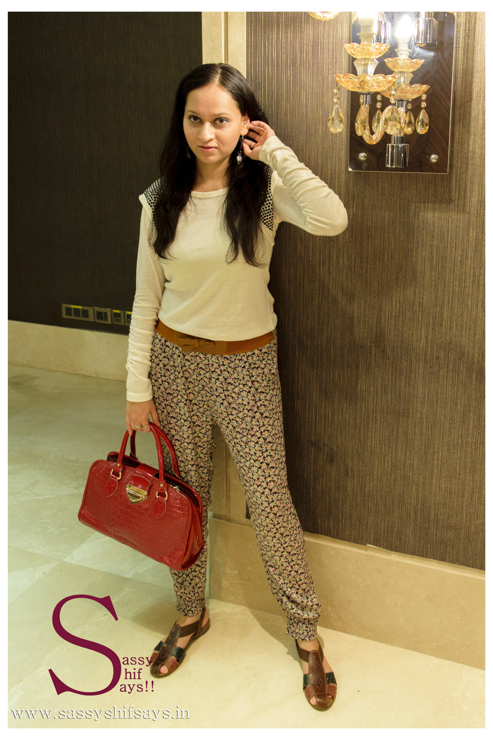What comfier way than to opt for the best pick this summer – HAREM pants. Recently, we’ve seen a lot of trending print play and different fabrics and textures like leather, chiffon and cotton. In terms of print and color, ditch the colour black and try something new and vibrant. Working with a cool pair of cottony, loose & floral printed harem with a solid brown base colour, I’ve quickly put together a look for you guys. I have opted for a semi-waisted pair and teamed it up with an off-white full sleeved top (which is again comfy as hell), tucked in just for the lady like finesse. I love the addition of MJ style studs on the shoulders!!